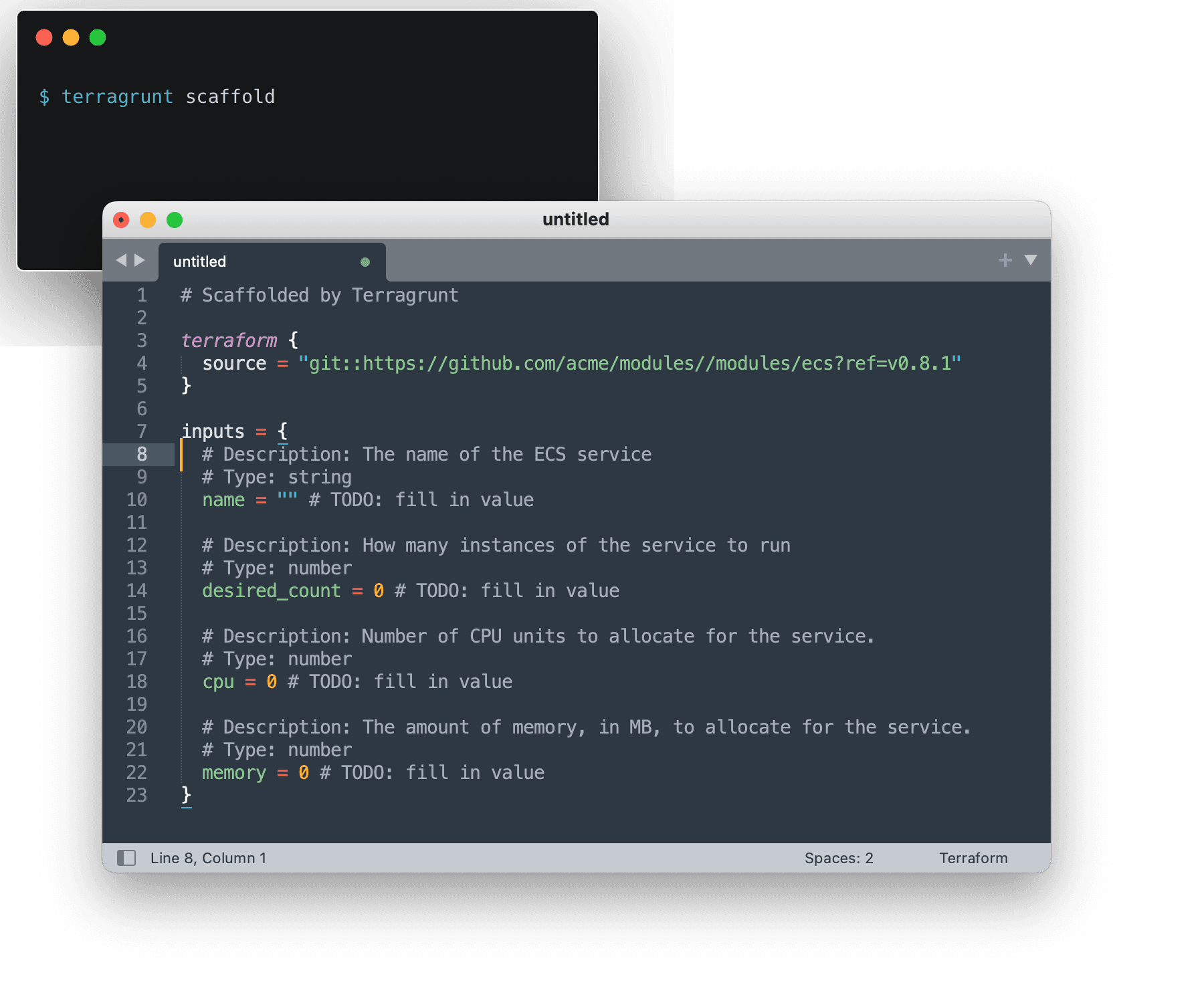 Scaffold new modules with a keystroke, with intelligent prompts for any configurations exposed in the selected template.